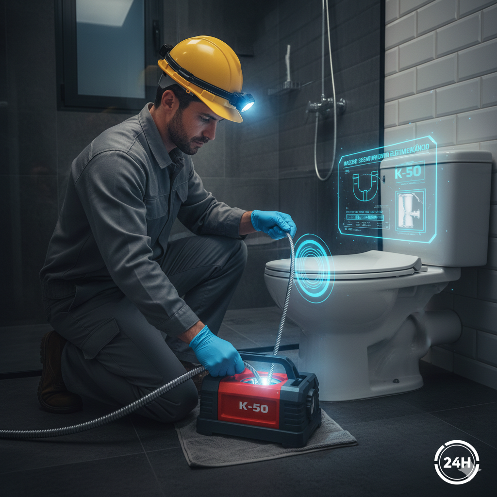 Para assegurar a preservação de acabamentos de alto padrão no Macedo, a engenharia prioriza metodologias não destrutivas. Com efeito, a utilização de máquinas eletromecânicas, como a K-50, permite a desobstrução através de cabos flexíveis que se adaptam à curvatura hídrica. Dessa forma, fragmentamos a obstrução sem aplicar força bruta, protegendo a bacia contra trincas.